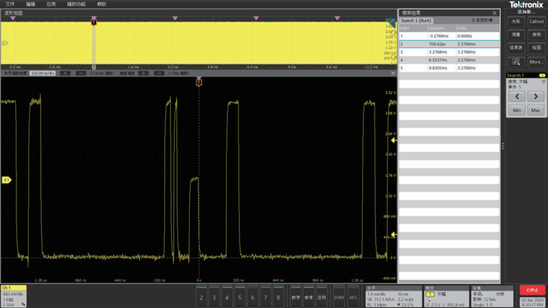 大家都知道上网使用搜索功能可以大大提升效率,找到自己感兴趣的页面或者信息。 这里介绍一种示波器的“搜索”功能。简单的讲,触发后捕获一段时间的波形,可以通到“搜索”设置条件,快速定位和标识满足条件的波形位置,这样就可以针对性的查看该位置波形,从而大大提升效率。 如果通过眼睛查看多达几千上万的波形,是非常辛苦的,且非常容易导致人为的漏失。 分析信号耗费时间长。提供波形列表,能帮助进行分析信号出现的周期, 从而得到信号出现的规律,如串扰等。