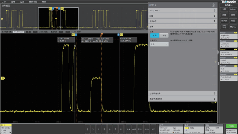 第五阶段:信号分析 示波器都具有基本的测量功能,可以帮忙用户进行快速的自动测试,如基本的幅值,频率,周期等参数。 但是现在因为信号越来越复杂,很多工程师希望能实现信号自定义测试,如指定波形位置测量,测量不仅只了解参数还希望能了解多周期的变化趋势,分布等信息。 示波器可以提供更加高级的自动测量功能,支持多达36种自动测试参数。并且支持测试项目的趋势图测试和直方图显示。 支持 Gate 选通功能,用户可以通过光标自行指定自动测试波形的区域,实现灵活测量。测试项目支持趋势图显示,可以显示频率,周期,幅值等随周期的变化, 从而帮忙工程师快速,准确,灵活的进行深度分析。