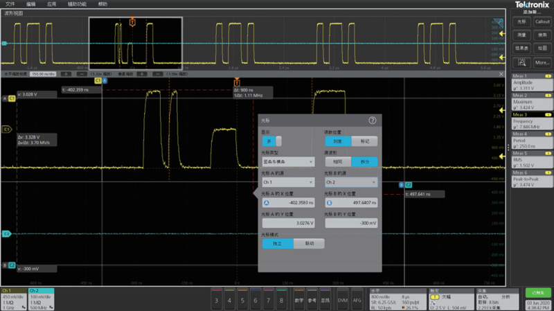 支持光标测试,用户客户指定对屏幕不同波形之间在幅值和时间的相关测试。