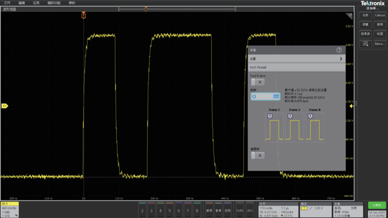 “欠幅触发”应用实例 分段存储 长记录长度,好处非常明显,同样的采样率可以连续捕获更长时间波形,或者同样的波形时间,可以设置更高采样率采集。