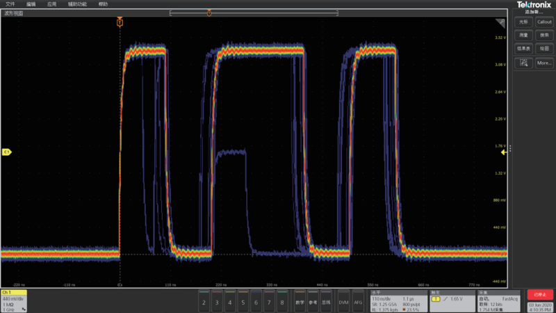 第二阶段:发现异常 什么样的信号称之为异常?幅值异常,脉宽异常,有 毛刺等等,总而言之区别于正常信号的都可以称为异 常信号!不定时的出现异常信号更是给工程师的测试工作雪上加霜。 在受访的工程师中,90% 的人表示,在使用示波器进行信号调试时,捕获异常信号是最难的,尤其是偶发的异常信号,他们希望示波器厂家能针对性设计功能帮忙解决这个问题。 泰克新一代示波器的两个功能可以快速发现异常信号。第一“Fast Acquision”快速捕获功能。这个功能可以使示波器波形捕获率能大大提升,最高实现捕 获 50 万次波形 / 秒,发现快速异常信号概率提升 100 倍。以下是测试对比图。 无限余晖功能,打开该功能示波器将探头接入的波形在示波器屏幕上留下一个痕迹,保持时间可以用户自定义,最长可以是无限时间。除了留下痕迹,还有一个好处,图形可以进行色温区别显示,暖色调如红色是说明该区域波形重复次数多,冷色调如蓝色代表的是该区域波形出现次数少,轻松分辨异常及正常信号。