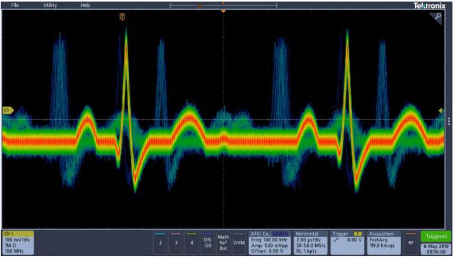 波形刷新率也就是波形捕获率是指示波器每秒钟可以显示多少条波形,示波器的“死区”时间指示波器对已采集到的波形进行处理和显示的时间,在此时间,示波器不采集信号。普通示波器的“死区”时间远远大于“显示区”的时间,这就让绝大部分时间的信号没被显示,导致无法观察到异常信号。而MS500系列的手持式示波器的刷新率可以达到19万次/秒,高刷新率示波器则大大减少了死区时间,从而能够迅速准确的发现异常信号,真正实现“看见”一般示波器“看不见”的事件。